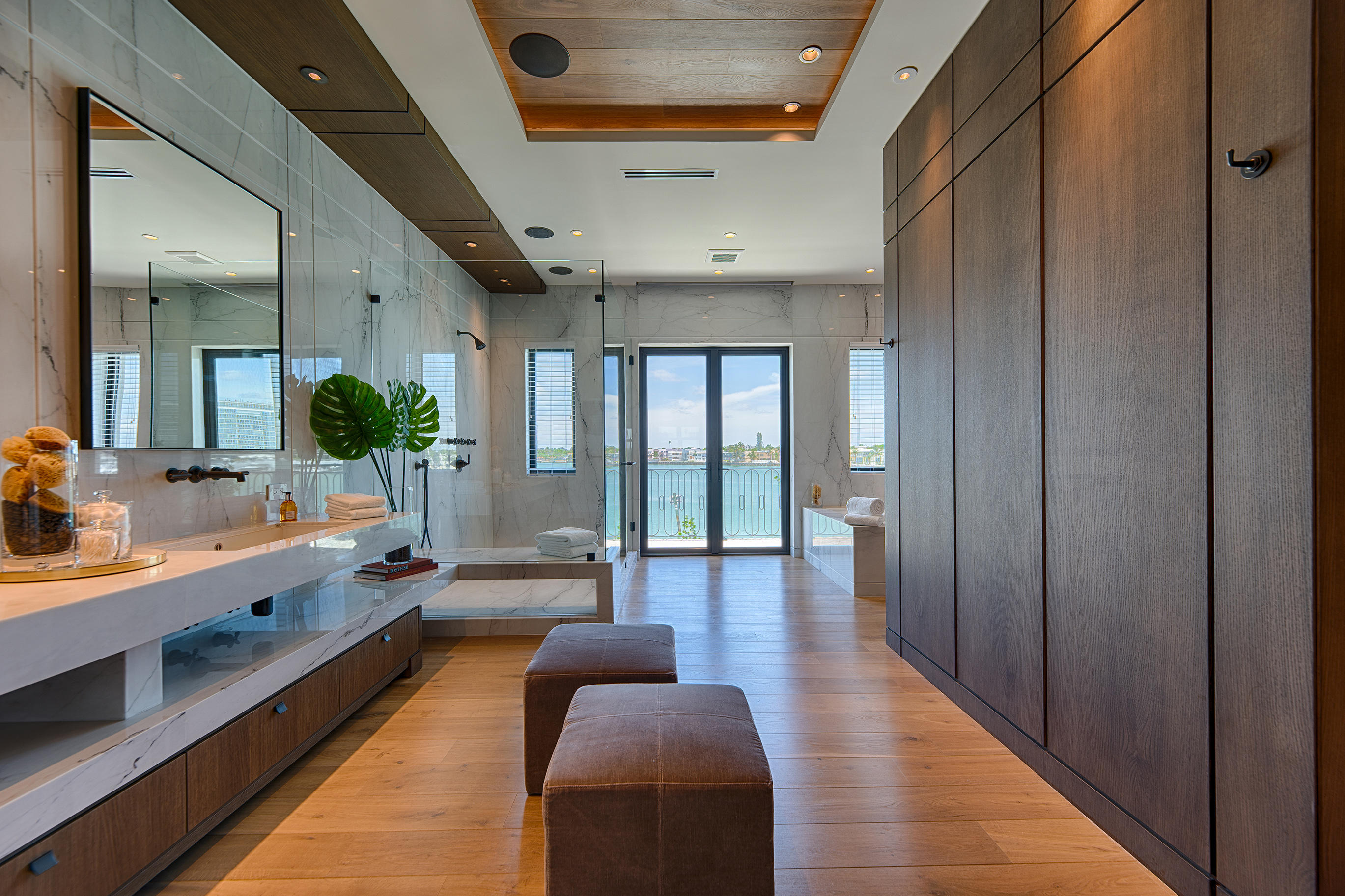 The ways in which 6650 Allison Road—which rests on a wedge-shaped lot that spreads toward 209 feet of waterfront—interacts with its enviable location is especially notable. As Solomon explains, “The pool is set at 13 feet above flood, which is desirable because if someone is cruising by the home by boat, the elevation—and the pool’s location behind the three-arched gazebo—gives you privacy.” The pool, with its striking blue-green tiles, is bordered by the same Florida keystone that covers the home. “This natural material is the common theme throughout the house’s exterior,” Solomon says, “which really sets it apart.”
