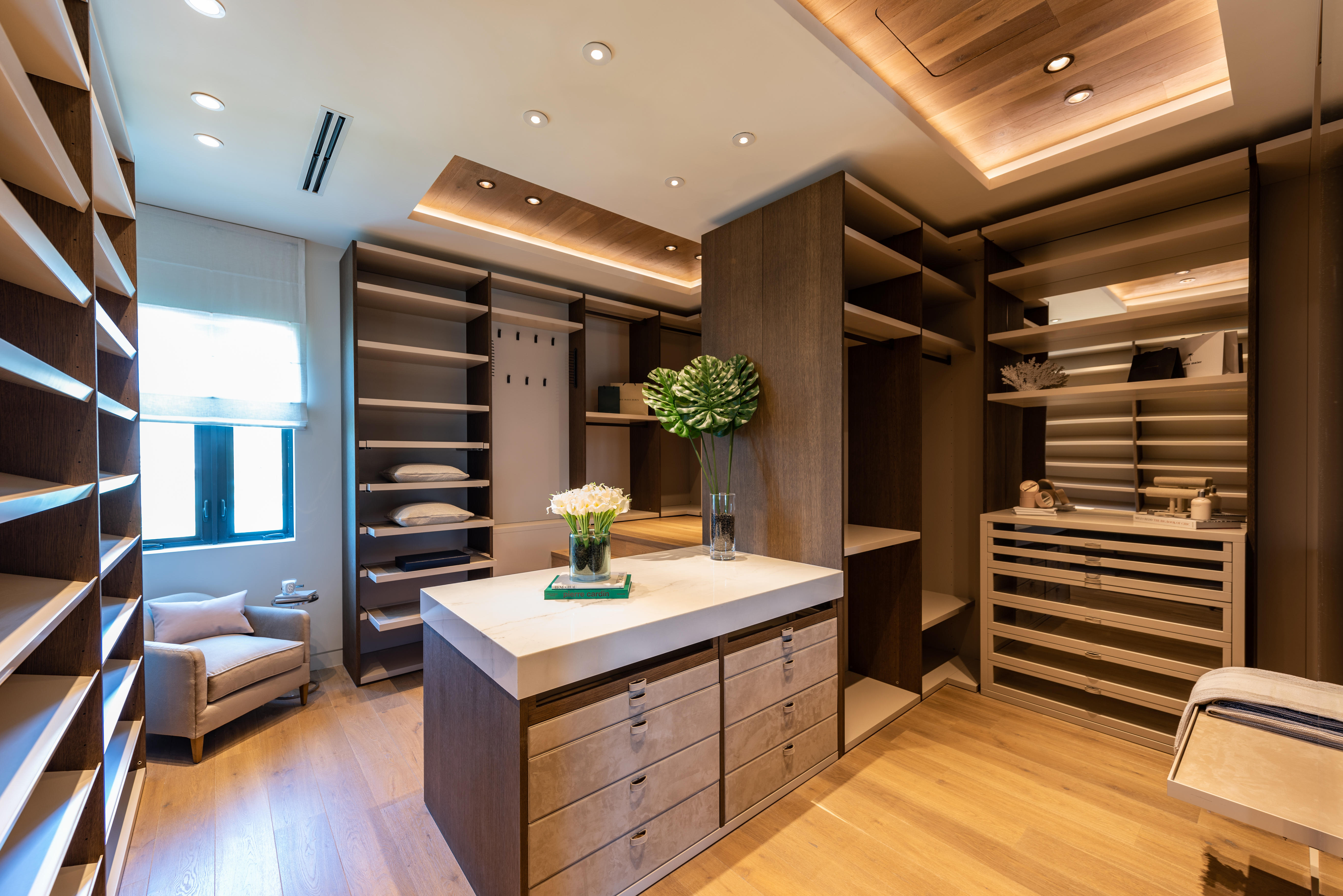 The interiors, neutral and lush, were created by Ryan Smaldone, principal of J & R Design, the go-to partner of Glaser and Domo. “J & R chose the finishes and worked very closely with Italkraft on the kitchen and closets,” Solomon explains. “I think this is their best project to date.” The kitchen is outfitted in bronze fixtures by Waterworks and features all Subzero appliances, including an entire wall of refrigeration—an expansive cabinet designed by Italkraft—that contains a double freezer, a wine cooler and a double refrigerator. Italkraft’s wood cabinetry is particularly rich, managing to make the kitchen at once luxurious and homey. The brand’s beautiful millwork can be appreciated throughout the home.